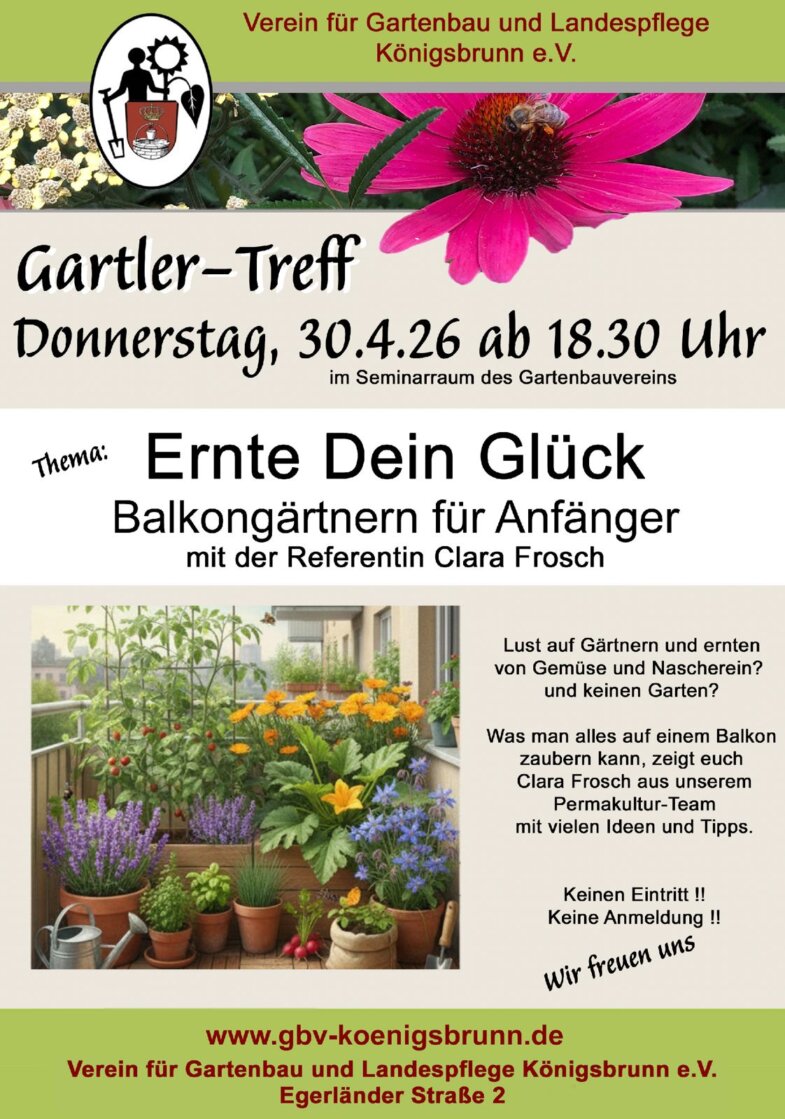 Am Gartler-Treff wird diesmal das Thema Balkon- und Terrassenbepflanzung beleuchtet. Eine Anmeldung hierzu ist nicht erforderlich.